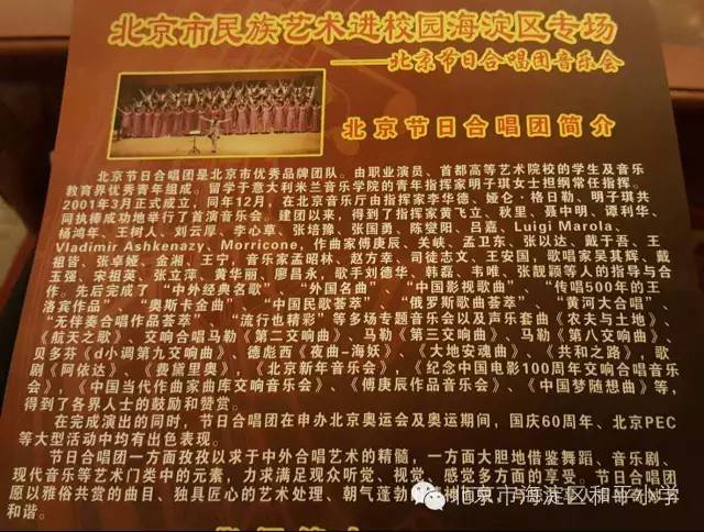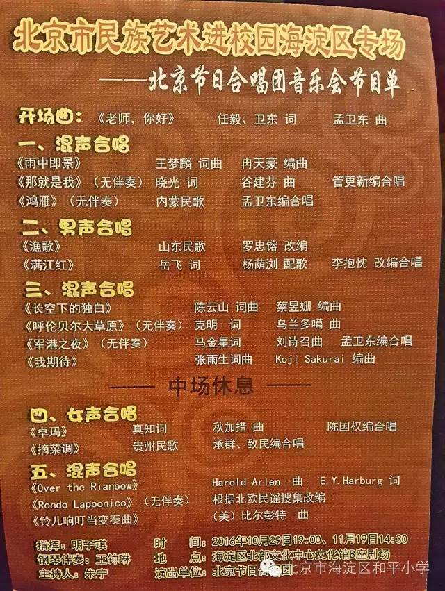 北京节日合唱团为我们师生,家长,共带来16首经典合唱曲。在一个个跳跃的音符中,在一句句动人旋律中,在一曲曲优美的歌声中,在一首首扣人心弦的乐音中……今天的音乐会欣赏活动圆满成功,期待下次再相聚音乐殿堂。