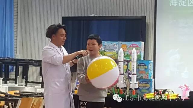 最搞笑还是“伯努利原理”的演示!在6.2班李明涛同学的协助下,陈老师不惜毁坏自己的形象,用大号“吹风机”吹向自己,吹向天空,吹向气球!渐渐的大家明白了高气压与低气压的关系,更明白了地铁站月台黄线的警示运用!